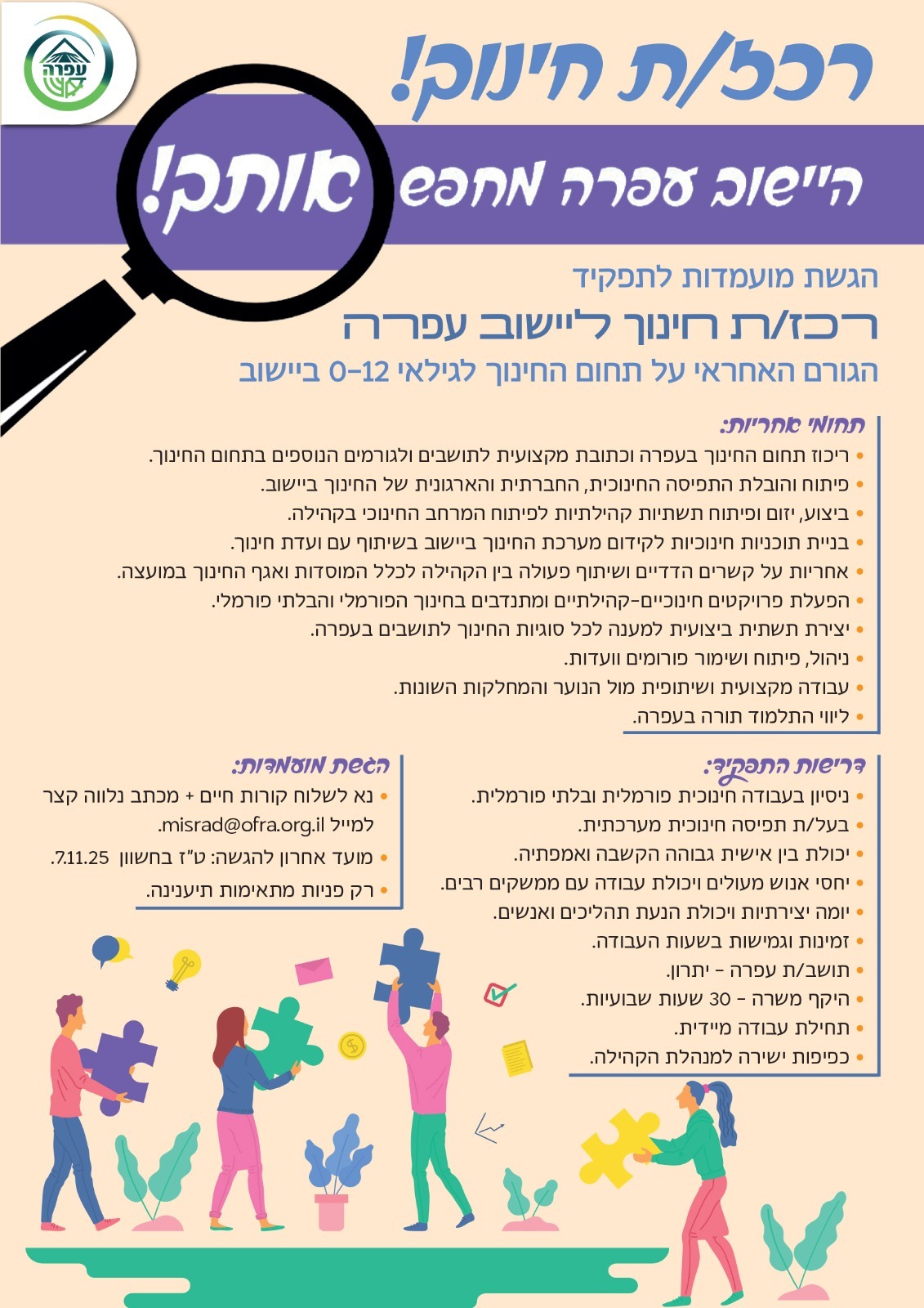 רכזת חינוך – עדיין ניתן להגיש מכרז עבור רכזת חינוך. נשמח להגשת מועמדים ראויים לתפקיד בהתאם לדרישות המכרז. עד למציאת מחליף ניתן לפנות אליי בנושאי חינוך דחופים.